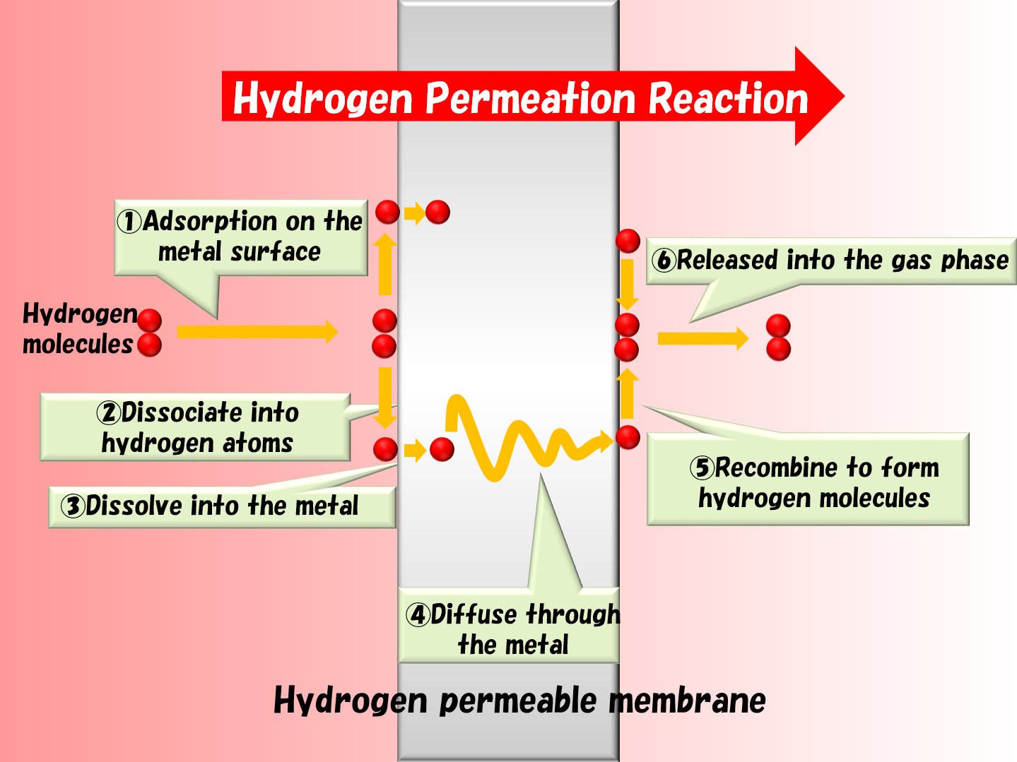 ☆ key point! A hydrogen permeable metal membrane is a metal membrane that only allows hydrogen to pass through. Hydrogen enters the gaps between metal atoms through a process called "dissolution", and then moves from gap to gap through a process called "diffusion". This allows only hydrogen to pass through the membrane, producing very pure hydrogen. |