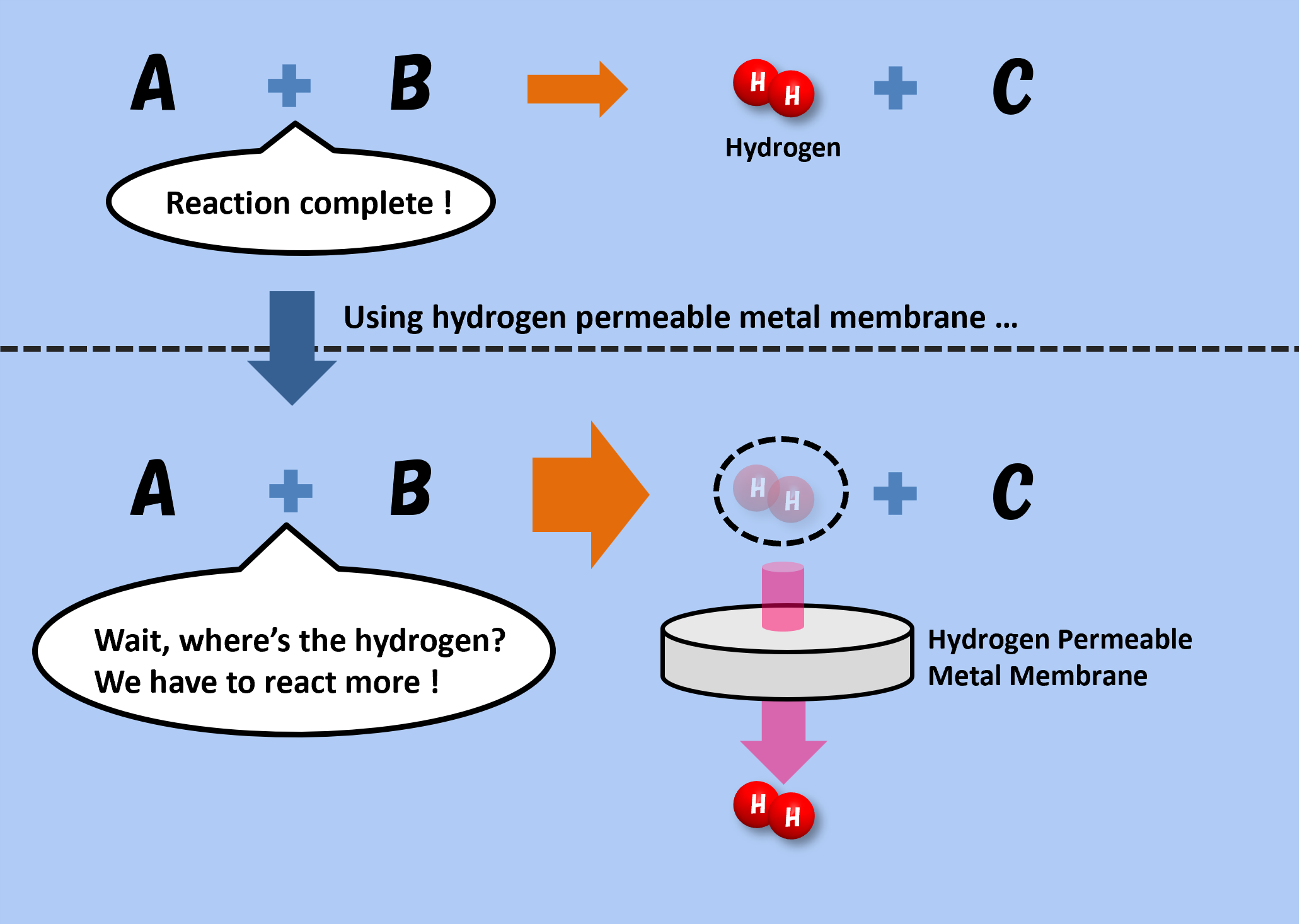 However, if there is a hydrogen permeable metal membrane that only allows hydrogen to pass through, even after the reaction occurs and hydrogen is produced, only the hydrogen escapes through the membrane.