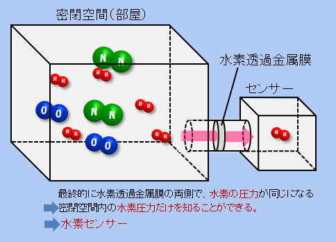 何か特定の物質がどれだけあるかを測る装置を「センサー」といいます。水素透過金属膜を使うことで、水素を感知する「水素センサー」を作ることができます。上の図のように、ある部屋に水素が入っていて、その量を知りたいとします。。そこに水素透過金属膜を持ってくると、水素だけが膜を通りぬけてセンサー側にたまります。最後には部屋の中とセンサーの中の水素の圧力が同じになります。そのときの、センサーの中の圧力を測れば、部屋の中の水素の量も分かるということです。水素透過金属膜を使うことで、他にどんなガスがいても水素のみがどれだけいるかを知ることができるため「水素センサー」として使うことができるのです。。