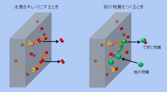 「水素透過金属膜とは」で説明しましたが、水素は2つの水素原子がカップルになった水素分子という状態で存在します。この仲良しカップルを引き離すのは、本来とてもむずかしいのですが、水素透過金属膜は1度原子になった水素が金属の中を溶解・拡散して反対側にぬけてそこで再結合して分子に戻るので、膜の反対側表面にはまだ分子にもどっていない水素がたくさんいるのです。こうした水素は再結合するために、相手を探してさまよっています。そこに違う物質を吹きつけてあげることで、相手を探している水素と反応させて全くちがう物質を生み出すことができます。