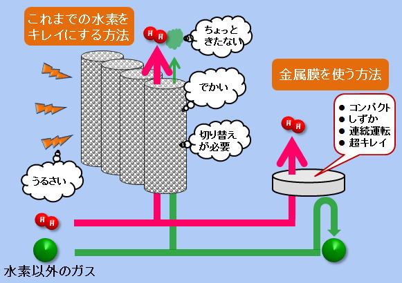 この仲良しカップルを引き離すのは、本来とてもむずかしいのですが、水素透過金属膜は1度原子になった水素が金属の中を溶解・拡散して反対側にぬけてそこで再結合して分子に戻るので、膜の反対側表面にはまだ分子にもどっていない水素がたくさんいるのです。