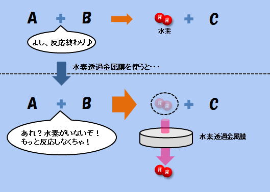 しかしながら、水素透過金属膜のように水素だけを通すものがあると、反応が起こって水素ができても、水素だけが膜を通っていなくなってしまいます。